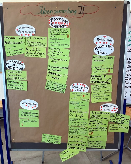 Da die Gruppengröße nicht mehr als drei Kleingruppen zuließ, wurden die drei Themen Marketing, Vernetzung und Wertschöpfungskette bearbeitet, während Unternehmerwohl und alternative Geschäftsmodelle im Nachgang bearbeitet werden müssen.
